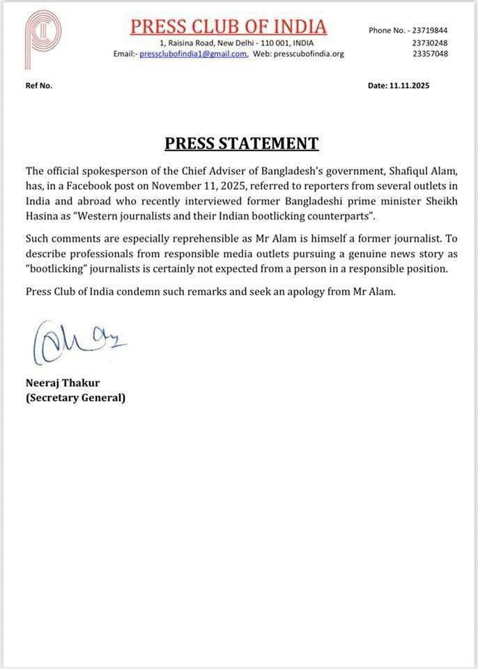 In a sharp escalation of rhetorical barbs between India and Bangladesh, the Press Club of India (PCI) has condemned inflammatory remarks by Shafiqul Alam, the official spokesperson for Muhammad Yunus, who branded Indian and Western journalists as “bootlicking counterparts” for conducting recent interviews with ousted Prime Minister Sheikh Hasina.