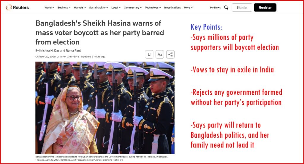 Reuters captured Joy’s pre-verdict fire on November 16, from Washington, D.C., as Dhaka prepared to televise Hasina’s likely conviction. The interview warned of Awami League-led obstructions to February’s polls if the May ban persists, citing national security probes into party leaders. Joy described Hasina’s Delhi exile as regal, predicted the death sentence, and vowed escalation: shutdowns, confrontations, and “whatever it takes” absent international intervention. It notes the garment industry’s protest-hit woes and recent Dhaka blasts (32 on November 12, plus Sunday explosions and torched buses), with 400+ Border Guards deployed.