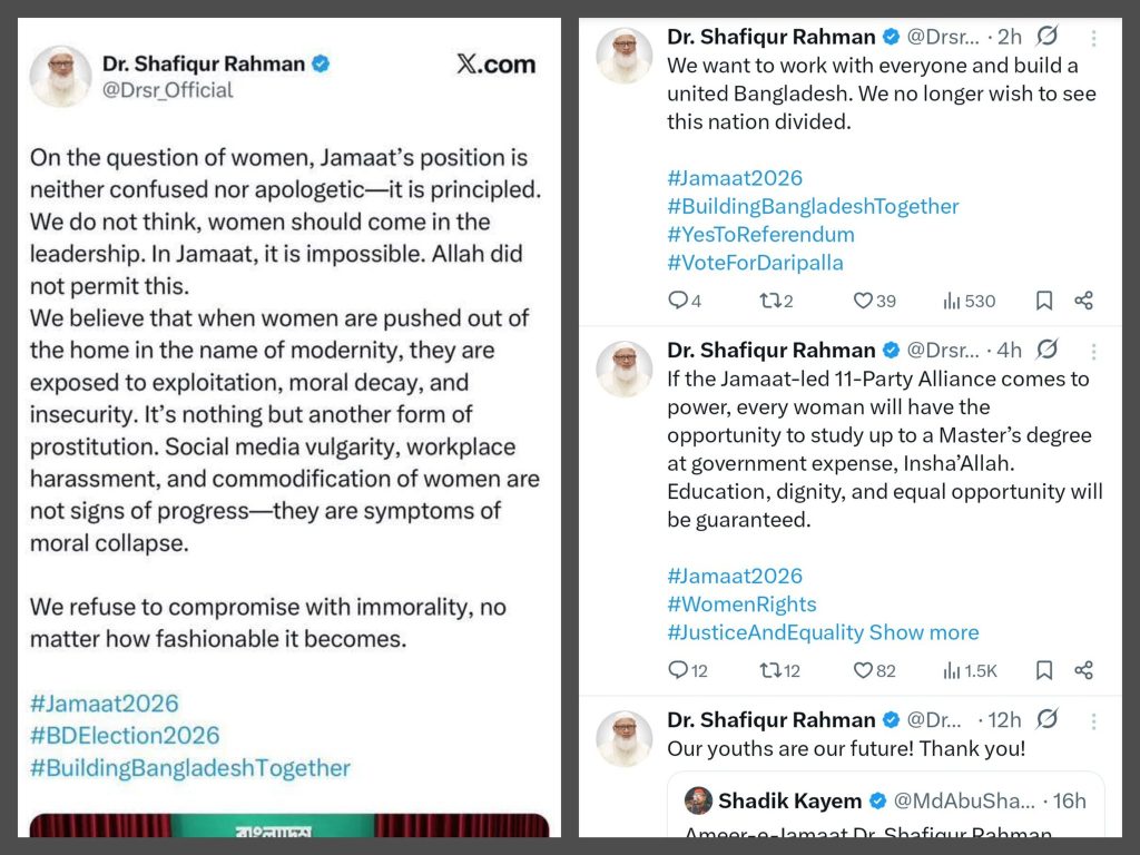 The post, shared by the @Drsr_Official handle on Saturday, said: โOn the question of women, Jamaat’s position is neither confused nor apologetic-it is principled. We do not think, women should come in the leadership. In Jamaat, it is impossible. Allah did not permit this.