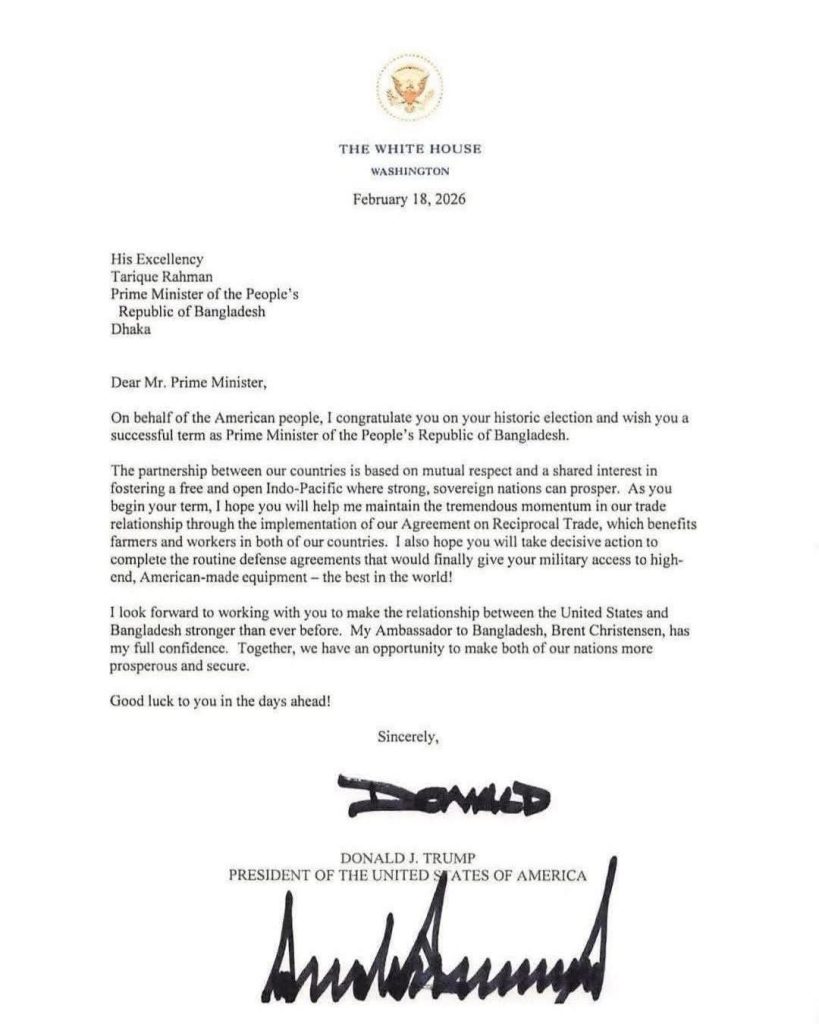 Trump’s message emphasises sustaining “strong momentum” in US-Bangladesh trade relations, specifically urging implementation of the Agreement on Reciprocal Trade, which was hastily signed by the Yunus administration on February 9, 2026โjust three days before the general election.