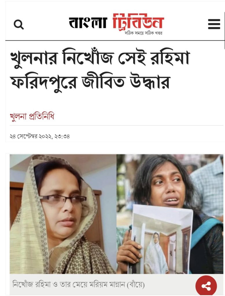 On August 27, 2022, Khulna’s Daulatpur erupted in grief. Rahima Begum, 55, vanishes from her home after “fetching water.” Daughter Mariam Mannan, a Tejgaon College alumna and 2024 uprising firebrand, ignites national fury on Facebook: “My motherâgone! RAB, DBâit’s you! Her cheek, her nose, her thighâI know her half-burnt corpse. No child mistakes her mother’s body!”