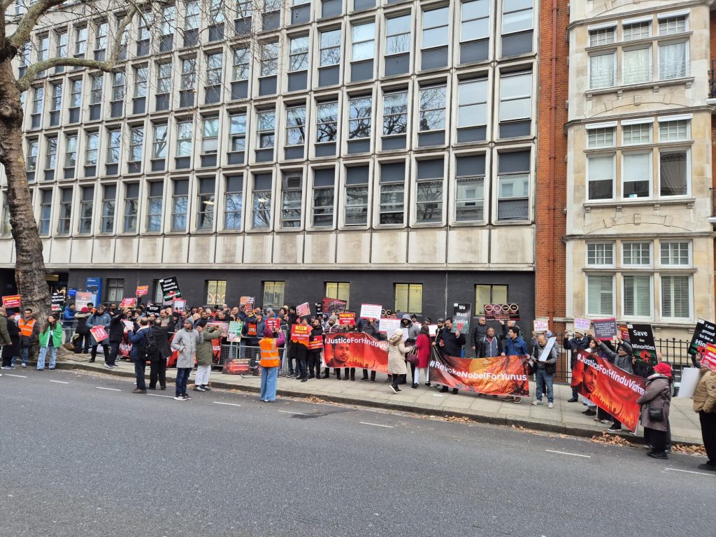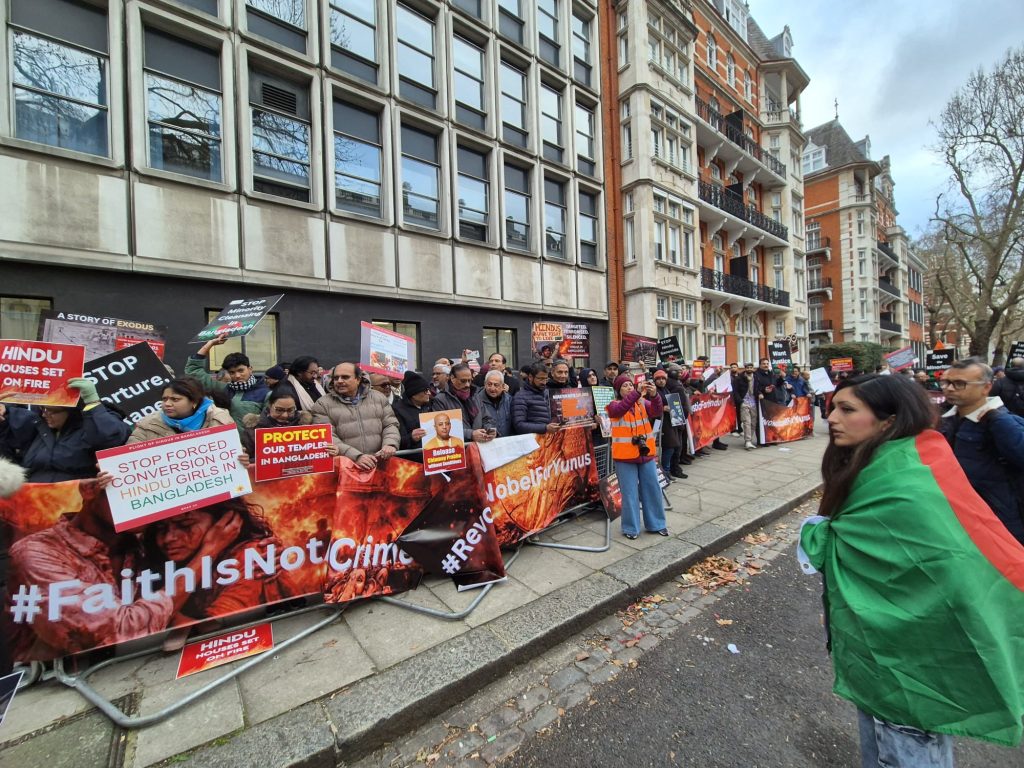 Dozens of protesters, primarily from the Bangladeshi diaspora and supported by human rights activists, gathered outside the Bangladesh High Commission in London’s Queens Gate area on Saturday, forming a human chain to condemn ongoing violence, arson, rape, and extremist mob attacks against minorities in Bangladesh.