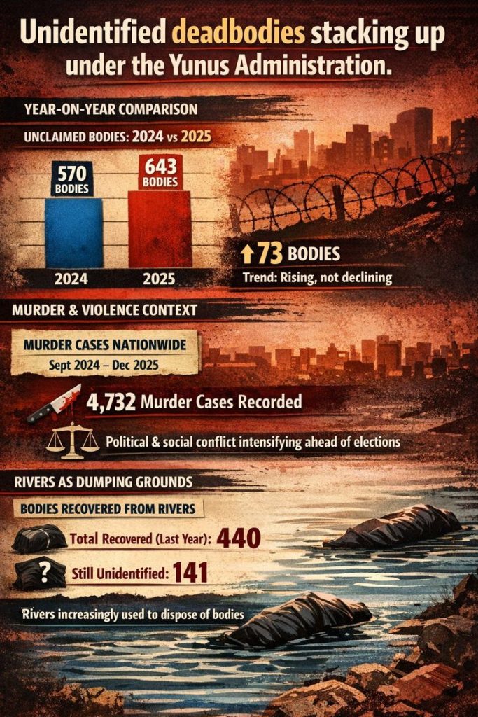 According to data from the humanitarian organisation Anjuman Mufidul Islam, 570 unclaimed bodies were buried in 2024. In 2025, that number rose to 643, an increase of 73 within a year. The rise is not merely numerical; it reflects a deepening collapse of law, order, and accountability.