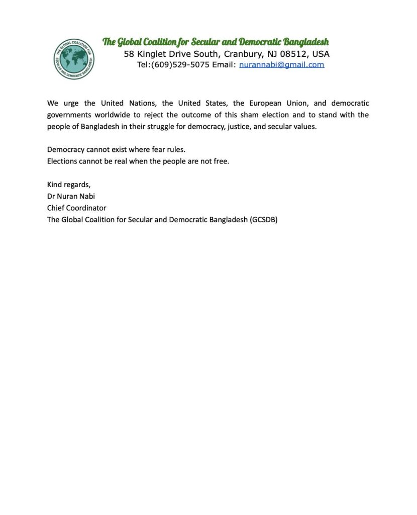 The Global Coalition for Secular and Democratic Bangladesh (GCSDB), a US-based advocacy group, has issued a strong condemnation of the upcoming national election in Bangladesh, labelling it a “so-called” and illegitimate process lacking freedom, fairness, and inclusion.